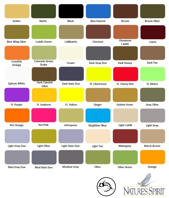 | Color | Black, Brown, Fl. Hot Pink, Fl. Melon, Fl. Orange, Fl. Yellow, Muskrat Gray, Olive, Orange, Pale Olive, Rusty Spinner, Sulphur Orange, Tan, White, Brown Olive, BWO, Callibaetis, Claret, Crawfish Orange, Dark Brown, Dark Olive, Fl. Chartreuse, Fl. Cherry Red, Fl. Purple, Fl. Sunburst, Gray Olive, Mahogany, Yellow, Pale Yellow, PMD, Light Olive, Red |